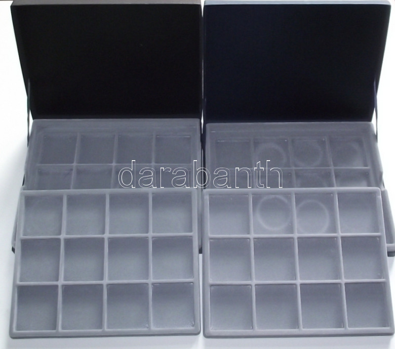 Leírás: 2db Éremtartó kazetta, egyenként 1 kivehető tálcával, 24 férőhellyel 50x50mm, új állapotban, egyik fekete, másik kék.