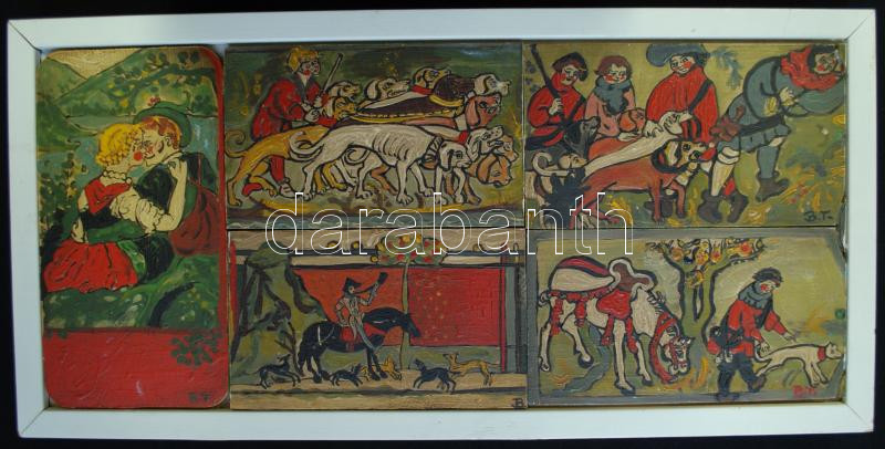 Leírás: B.T. szignóval: 5 db táblakép naiv stílusban, olaj, kerámia lapokra, kettő sérült, 49×22 cm
