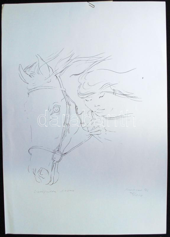Leírás: Melocco Miklós - Szélfútta lovas, szita 35/150 40×63 cm,keret nélkül.
