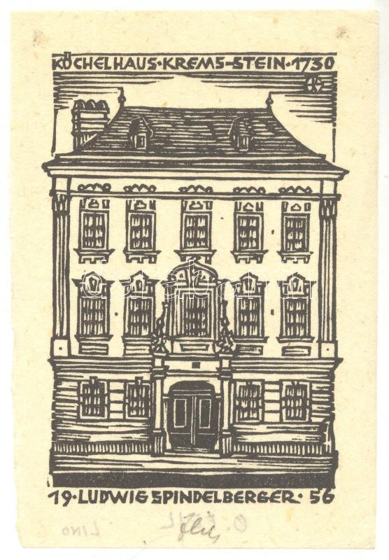 Leírás: O. Feil jelzéssel: Küchelhaus Krems-Stein 1730 / Ludwig Spindelberger 1956, fametszet, 8x12cm