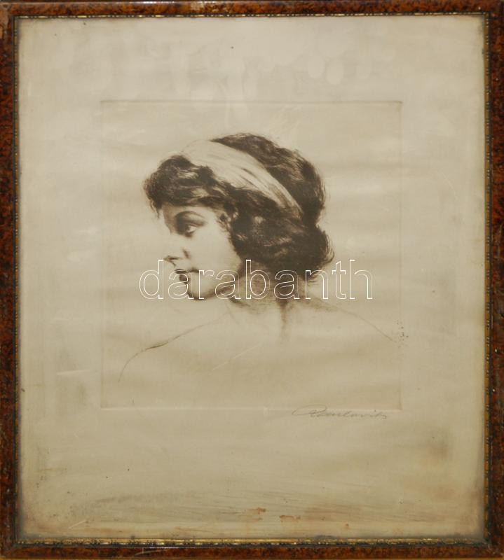 Leírás: Paulovits Pál(1892-1975): Női fej, rézkarc, papír, jelzett, üvegezett keretben, 27×22 cm