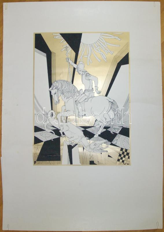 Leírás: Szász Endre (1926-2003): Sárkányölő Szent György, szitanyomat, jelzett 100/40, apró hibával, 57×43 cm