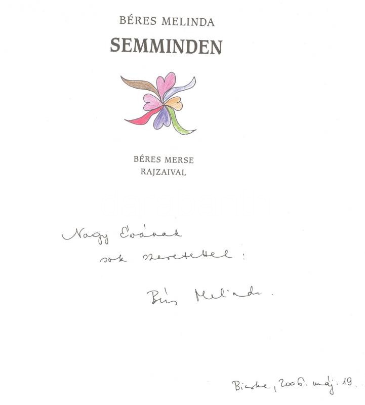 Béres Melinda: Semminden mesekönyv. Dedikált! Akovita. 2005. https://www.darabanth.com/hu/167-Gyorsarveres/167.0/Festmeny-mutargy-papirregiseg-egyeb/Konyvek-Egyeb-ritkasagok~500055/Beres-Melinda-Semminden-mesekonyv-Dedikalt-Akovita-2005~II554737
