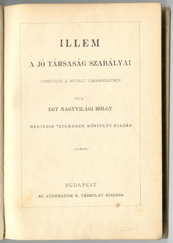 Egy nagyvilági hölgy: Illem, a jó társaság szabályai. Útmutató a művelt társaséletben. Bp., én. Athenaeum 258p. Kissé kopott festésű egészvászon kötésben, aranyozott lapszélekkel