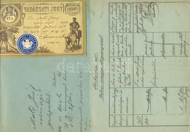 1878 Vadászjegy (12Ft) kézbesítési ívvel, illetékbélyeggel https://www.darabanth.com/hu/167-Gyorsarveres/167.0/Festmeny-mutargy-papirregiseg-egyeb/Okmanyok~500030/1878-Vadaszjegy-12Ft-kezbesitesi-ivvel-illetekbelyeggel~II560675