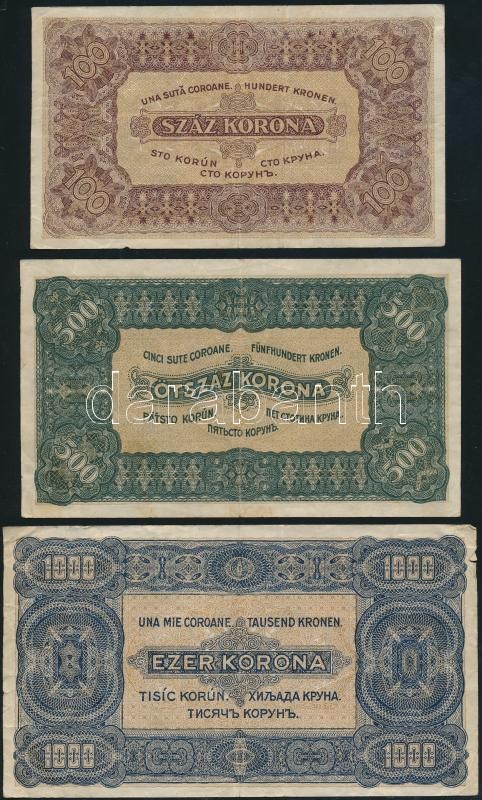 Leírás: 1923. "Magyar Pénzjegynyomda Rt" 100K + 500K + 1000K T:II-,III