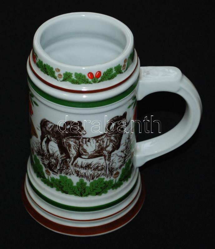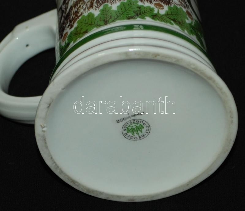 Leírás: Vadászmotívumokkal díszített festett jelzett Freiberger porcelán söröskorsó /
