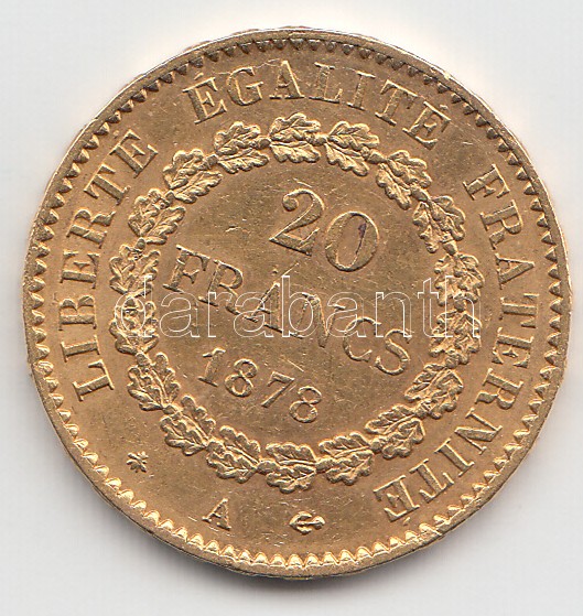 Fra... https://www.darabanth.com/hu/168-Gyorsarveres/168.0/Numizmatika/Magyar-es-kulfoldi-arany-penzek~2000356/FranciaorszagModern-Koztarsasag-1878A-20Fr-Au0900-6-45g-T2-K-3Cbr3EFranceModern-Republic-1~II563359