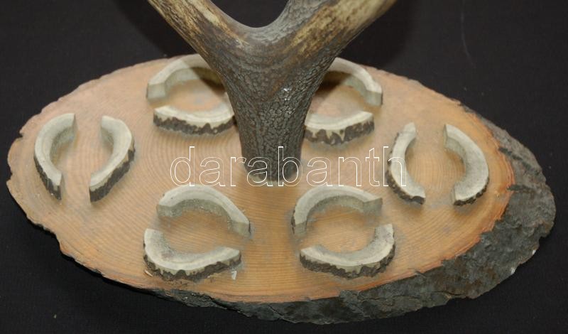 Leírás: Asztali őzagancs trófea feles pohár tartókkal fa lapon 35x21cm