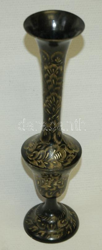 Leírás: Díszes fekete festett réz váza, kis kopással/