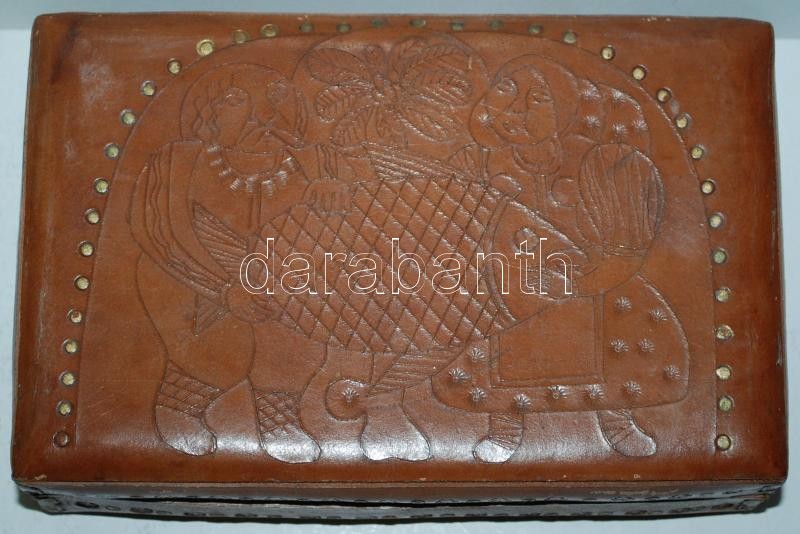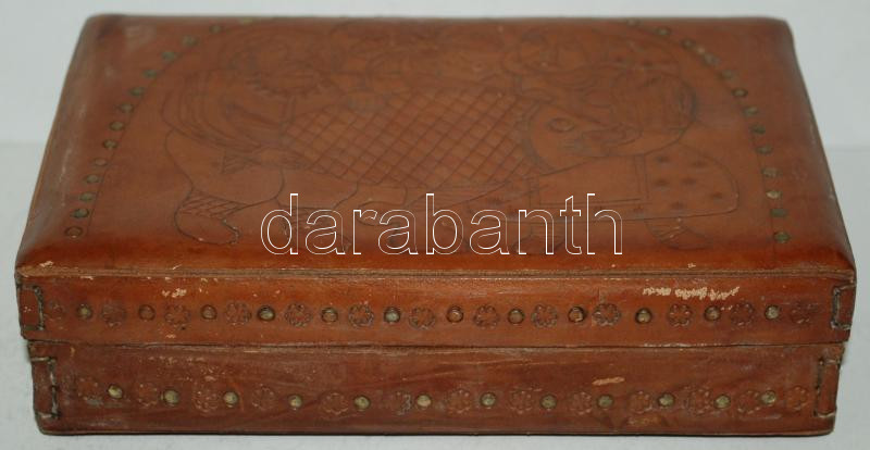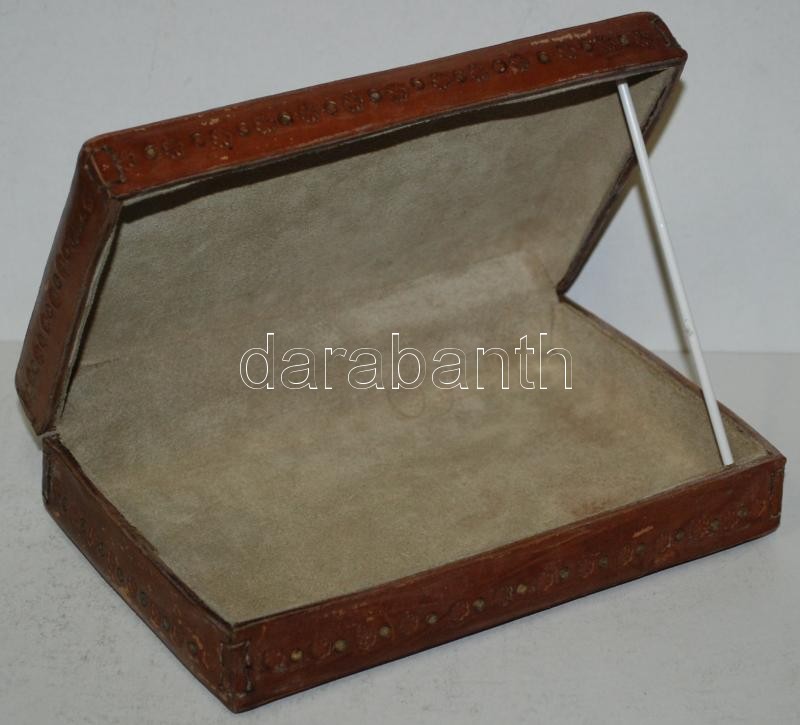 Egyedi díszítésű iparművész bőr doboz kis aranyozással, a Tannimpex Külkereskedelmi Vállalat emblémájával /