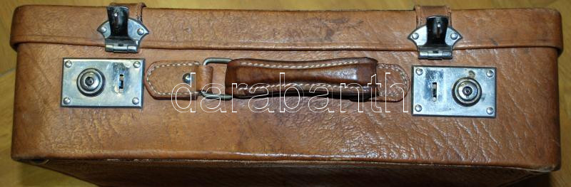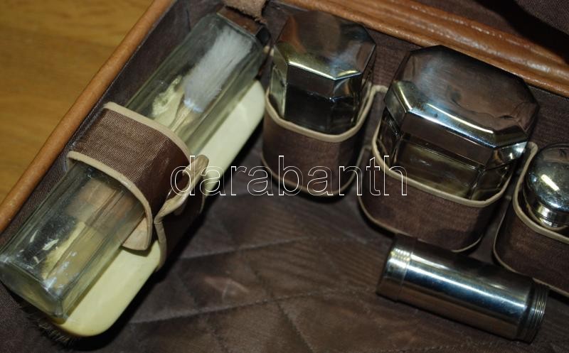 Háború előtti bőr utazótáska hozzá tartozó, eredeti pipere-felszereléssel (üvegcsék, hajkefe, zsilettpenge stb.), korának megfelelő állapotban /
