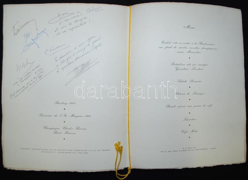 1971 Parizsi hotel menükártyája szignós rézkarccal és európai cserkészvezetők aláírásával a belsején / Paris Hotel menu-card with signed engraving. Boy -scout signatures on the inside
