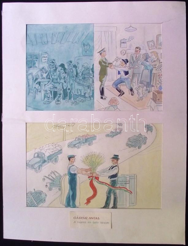 Leírás: Gáspár Antal (1889-1959): A Város és a falu 10 éve, vegyes technika, papír, jelzett, 2x 32x23 cm