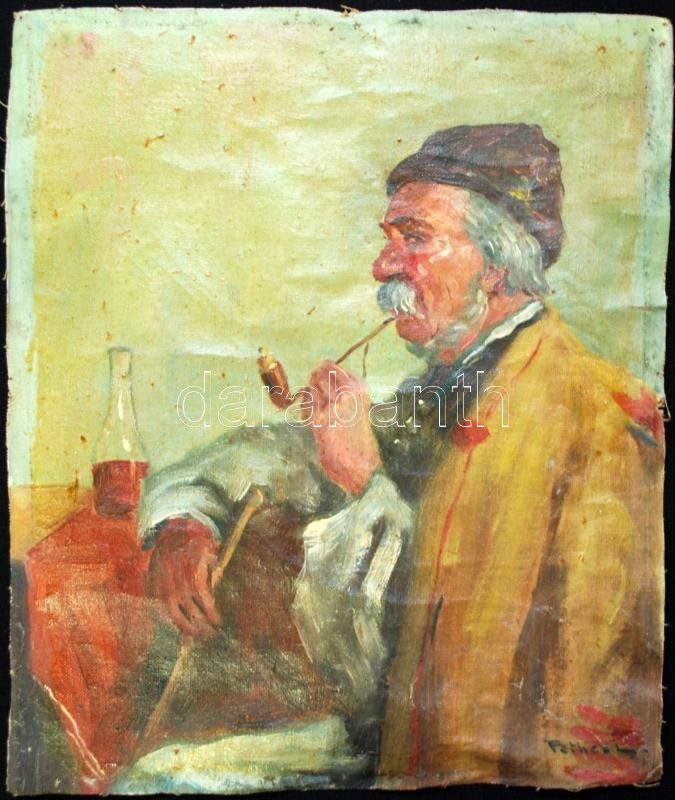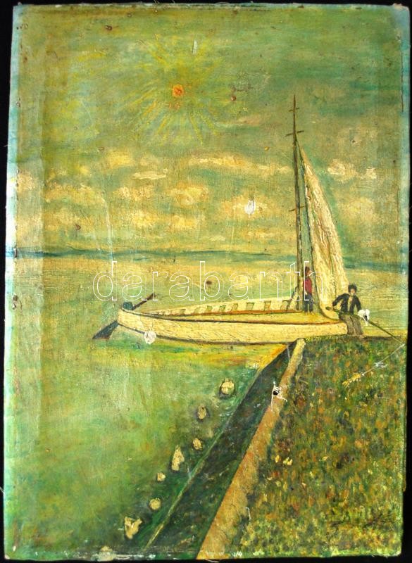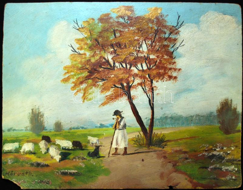 Három darabos kép tétel: Pethes L jelzéssel pipázó öreg, Horváth jelzéssel juhász, olvashatatlan jelzéssel vitorlázók, mind olaj, vászon és farost, kisebb hibákkal, 23×33 cm
