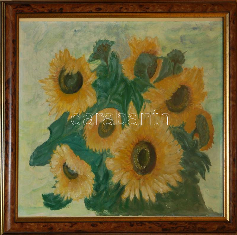 Ismeretlen alkotó: Napraforgók, olaj, karton, üvegezett jó keretben, https://www.darabanth.com/hu/169-Gyorsarveres/169.0/Festmeny-mutargy-papirregiseg-egyeb/Festmenyek-es-grafikak~4000001/Ismeretlen-alkoto-Napraforgok-olaj-karton-uvegezett-jo-keretben-~II546309