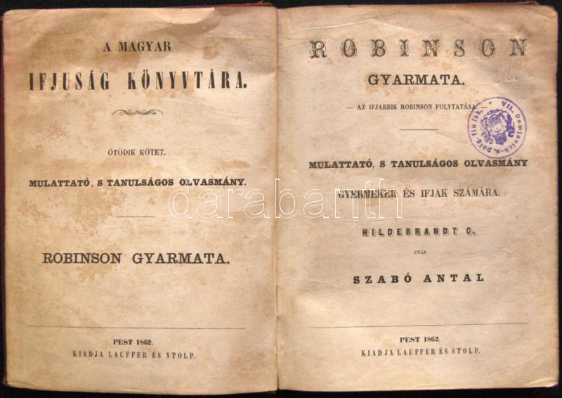 Hildebrandt C.: Robinson gyarmata. Az ifjabbik Robinson folytatása.- Mulattató, s tanulságos olvasmány gyermekek és ifjak számára. Pest, 1862, Lauffer és Stolp. (Lehmann K. és tsa. ny. Eszék.) Kiadói, festett, aranyozott vászonkötésben. (grinc javított) 181p.
