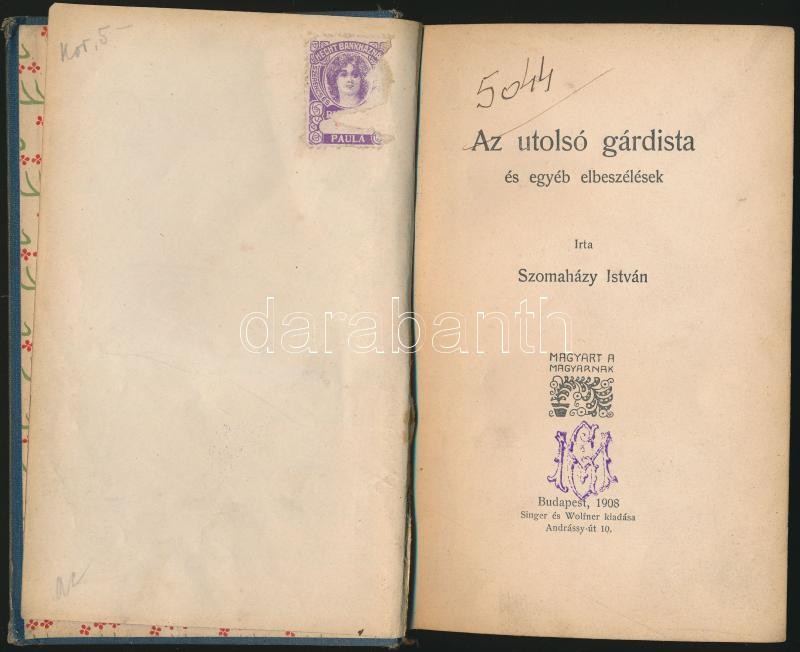 Szomaházy István: Az utolsó gárdista és egyéb elbeszélések (Szomaházy István munkái). Bp, 1908, Singer és Wolfner. Gottermayer-kötésben. A kötése viseltes, de belül jó állapotú