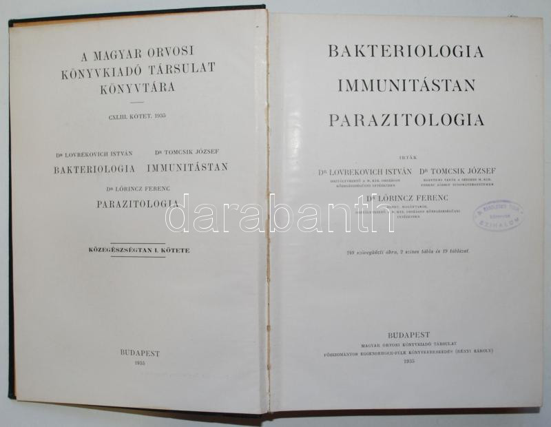 A Magyar Orvosi Könyvkiadó Társulat Könyvtára: Dr. Lovrekovich István - Dr. Tomcsik József - Dr. Lőrincz Ferenc: Bakteriológia, immunitástan parazitológia. Bp., 1935, Magyar Orvosi Könyvkiadó Társulat. Kiadói egészvászon kötésben, illusztrált
