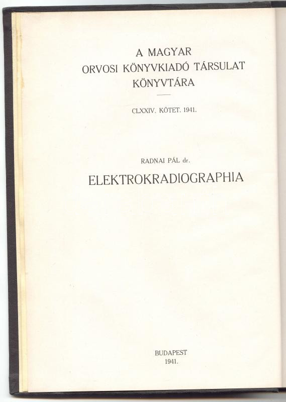 A Magyar Orvosi Könyvkiadó Társulat Könyvtára: Dr. Radnai Pál: Elektrokardiographia; Dr. Grósz István: A szembetegségek physicotherapiája; Dr. Wein Dezső: Az állkapocssérülések gyógyítása; Dr. Darányi Gyula: Élelmezési táblázatok. Egybekötve. Bp., 1941, Magyar Orvosi Könyvkiadó Társulat. Kiadói egészvászon kötésben, gazdag képanyaggal, jó állapotban