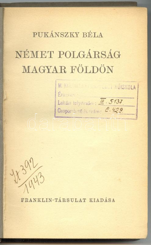 Pukánszky Béla: Német polgárság magyar földön. Bp., é.n., Franklin-Társulat. Kiadói egészvászon kötésben, jó állapotban. Az előzéklap hiányzik, a borítón pacák