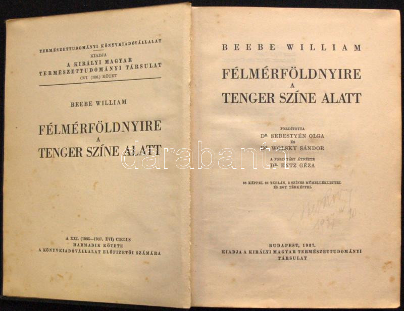 Beebe William: Félmérföldnyire a tenger színe alatt. Bp., 1937 M. kir. Természettudományos társulat. Gazdag képanyaggal, fotókkal. Kiadói egészvászon kötésben