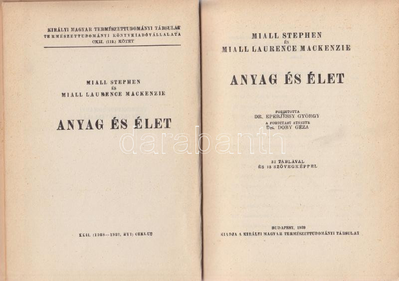 Leírás: Stephen-Mackenzie: Anyag és élet 32 táblával és 15 szövegképpel. M. kir. Természettudományos Társulat. Bp., 1939