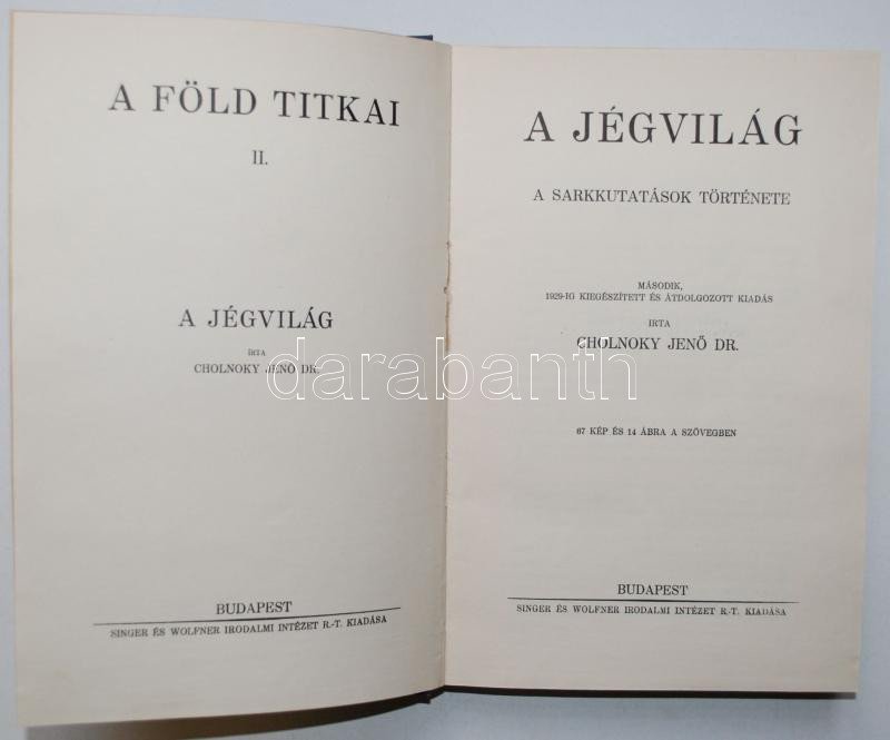 Cholnoky Jenő: A jégvilág. (A Föld titkai II.) 67 kép és 14 ábra a szövegben. Bp., 1930, Singer és Wolfner. Kiadói aranyozott egészvászon kötésben, jó állapotban (a címlapnál kis sérülés)