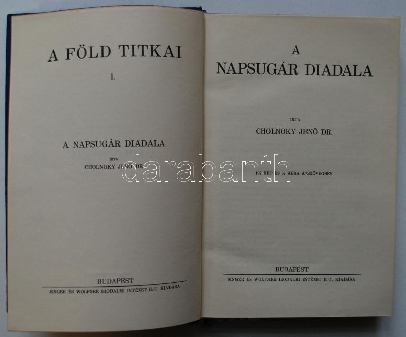 Cholnoky Jenő: A napsugár diadala. (A Föld titkai I.) 107 kép és 67 ábra a szövegben. Bp., 1930, Singer és Wolfner. Kiadói aranyozott egészvászon kötésben, jó állapotban