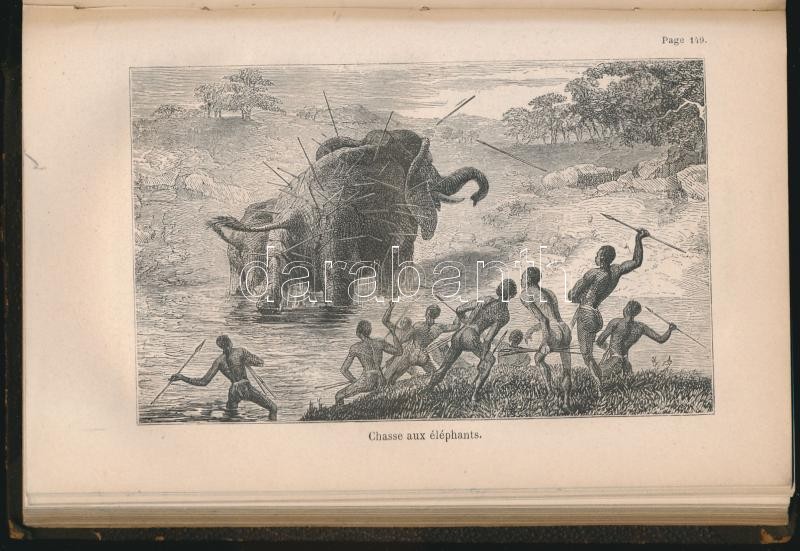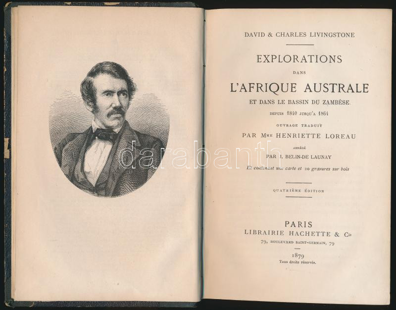 David & Charles Livingstone: Explorations dans l'Afrique Australe et dans le bassin du Zambese depuis 1840 jusq'a 1864. Paris, 1879, Librairie Hachette & Cie. Kiadói félvászon kötésben, 20 metszettel illusztrálva, Helene Lantos ex librissel, apró hibákkal /