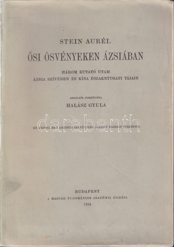 Stein Aurél: Ősi ösvényeken Ázsiában. Három kutató utam Ázsia szívében és Kína északnyugati tájain. Ford. Halász Gyula. Bp., 1934, MTA. Gazdag képanyaggal, kiadói papírkötésben. A hátsó borító levált
