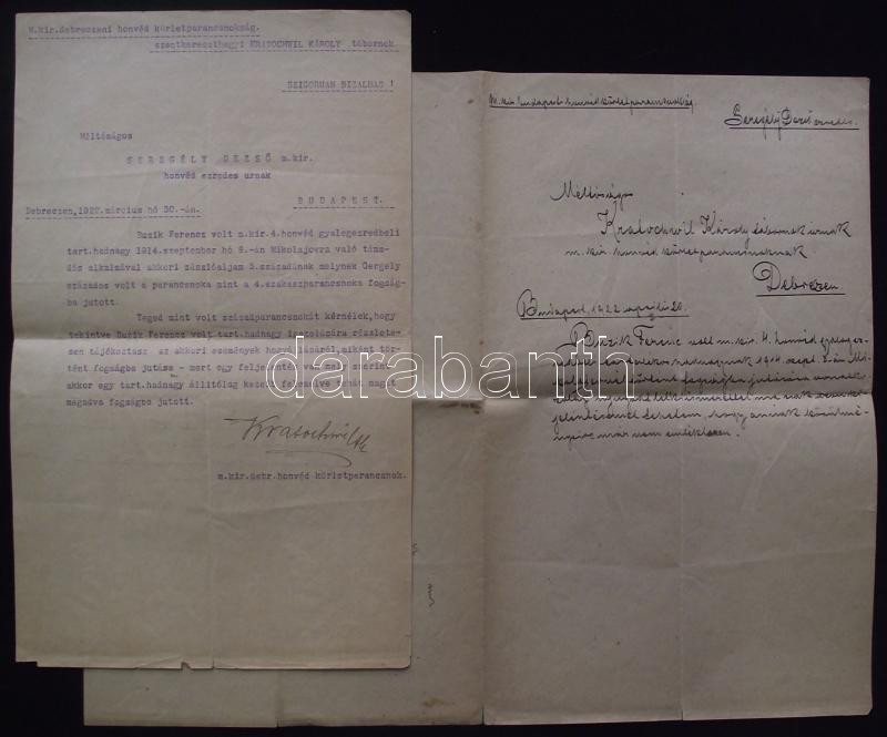 1922 Kratochwil Károly tábornok aláírt, szigorúan bizalmas levele Seregély Dezső M. kir. honvéd ezredeshez, hátoldalán Seregély Dezső kézzel írt válaszának piszkozata, és külön lapon a tisztázat