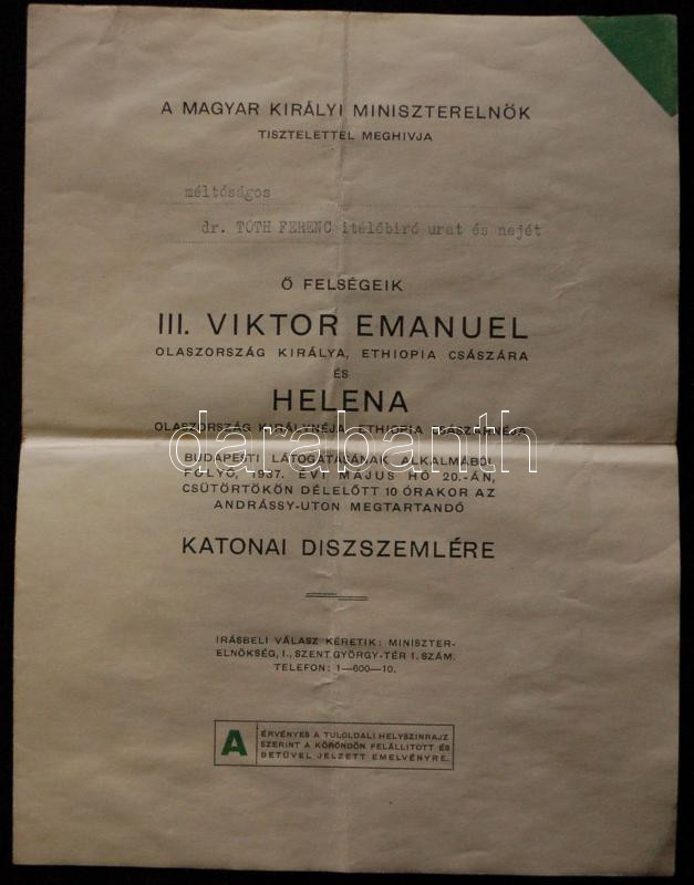 1937 Miniszterelnöki meghívó Viktor Emánuel olasz király budapesti látogatása alkalmából tartott katonai díszszemlére. Térképpel /