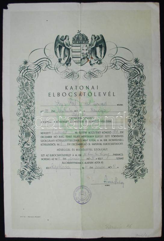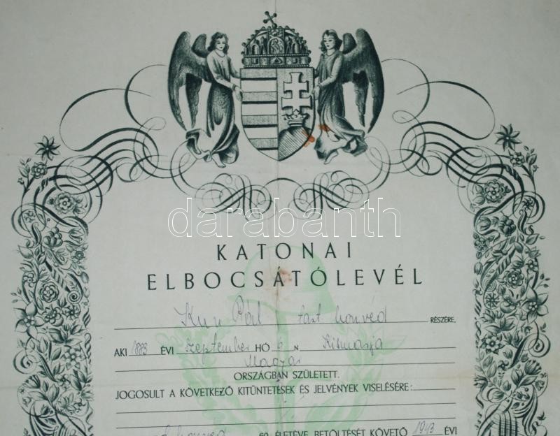 1944 Katonai elbocsátólevél https://www.darabanth.com/hu/169-Gyorsarveres/169.0/Festmeny-mutargy-papirregiseg-egyeb/Militaria~4000023/1944-Katonai-elbocsatolevel~II570614