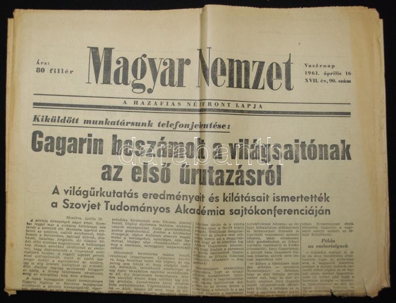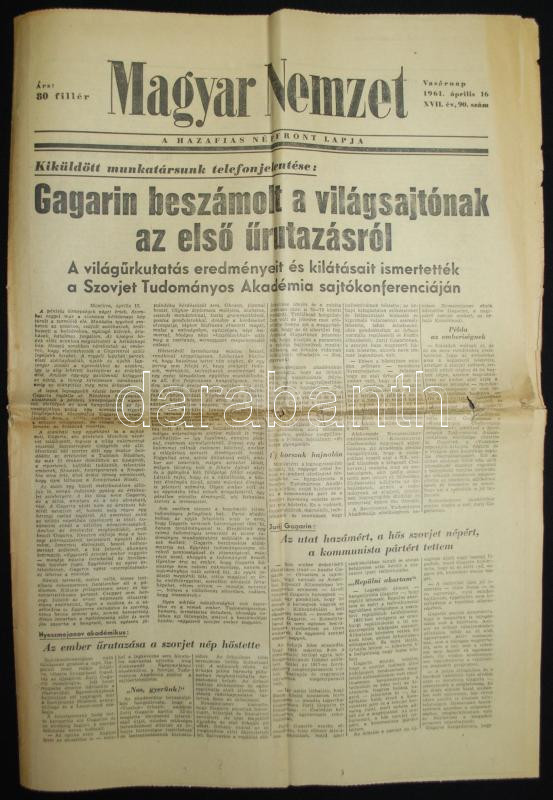1961. ápr. 16. Magyar Nemzet szám 4 oldalas beszámolóval Gagarin űruta... https://www.darabanth.com/hu/169-Gyorsarveres/169.0/Festmeny-mutargy-papirregiseg-egyeb/Nyomtatvanyok~4000025/1961-apr-16-Magyar-Nemzet-szam-4-oldalas-beszamoloval-Gagarin-urutazasarol~II568990