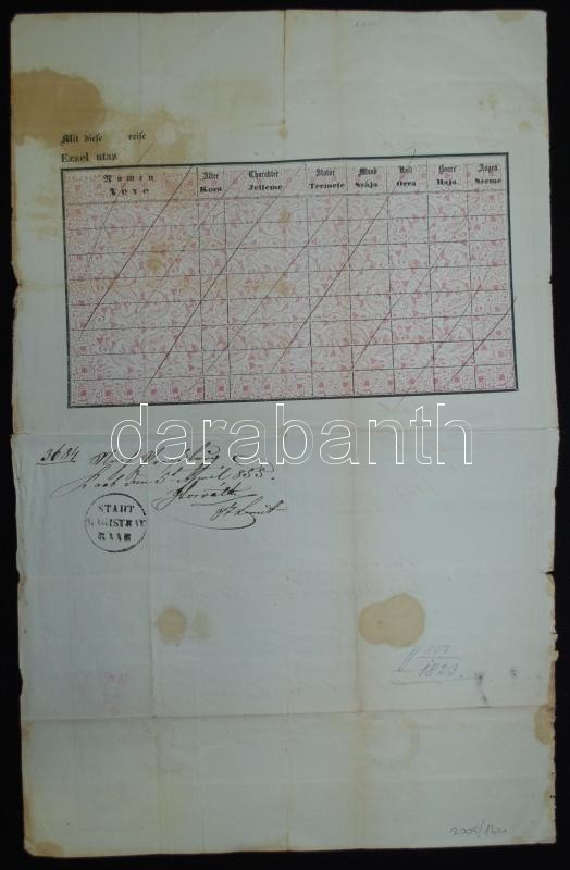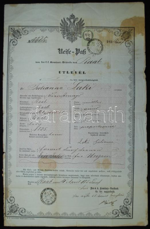 Passport with d... https://www.darabanth.com/hu/169-Gyorsarveres/169.0/Festmeny-mutargy-papirregiseg-egyeb/Okmanyok~4000014/1855-Gyorben-kelt-utlevel-6kr-CM-illetekbelyeggel--3Cbr3EPassport-with-document-stamp~II570622