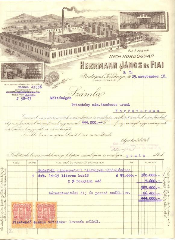 1925 Herrmann János és Fiai Első Magyar Mechanikai Hordógyár R.T. dísz... https://www.darabanth.com/hu/169-Gyorsarveres/169.0/Festmeny-mutargy-papirregiseg-egyeb/Reklam~4000018/1925-Herrmann-Janos-es-Fiai-Elso-Magyar-Mechanikai-Hordogyar-RT-diszes-fejleces-szamlaja-~II545907