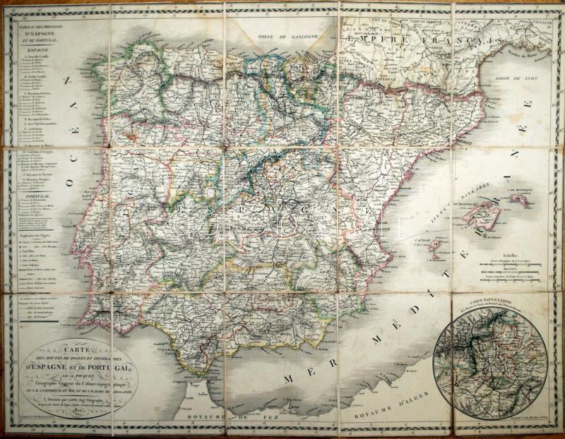 1810 Charles Picquet (1771-1827) - Lapie: Carte des routes de postes et itinéraires d'Espagne et de Portugal. Spanyolország és Portugália postai térképe Madrid környéke melléklettel. Kartonon helyreállított cca 1880 /
