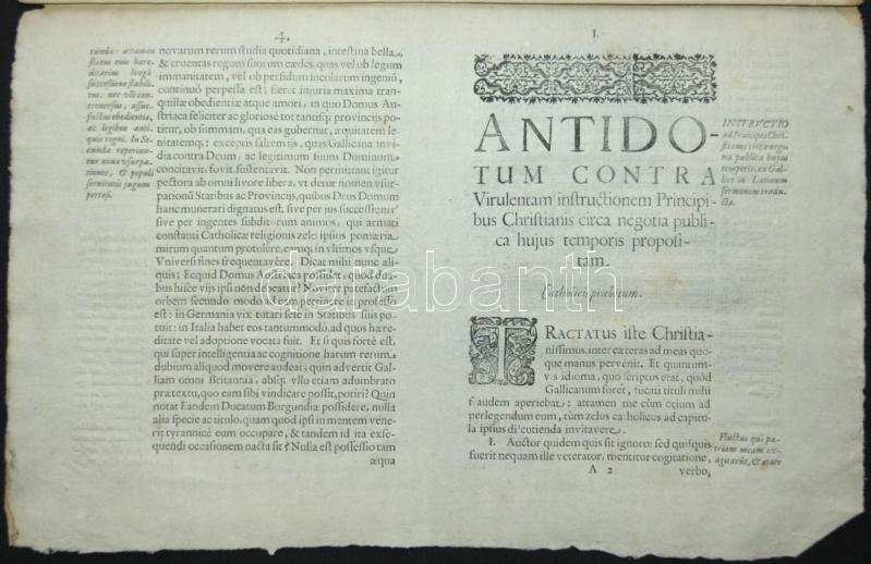 Antidotum contra virulentam instructionem principibus christianis circa negotia publica propositam, Augusta Vindelicorum (Augsburg) 1632. felvágatlan ívekben / Uncut in original sheets 37p.