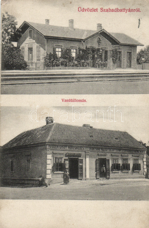 Leírás: Szabadbattyán vasútállomás és Weisz László vegyeskereskedése, italmérése