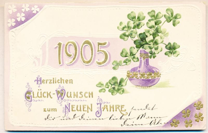New Year, 1905, clover, litho, Emb. (EK) https://www.darabanth.com/hu/169-Gyorsarveres/169.0/Kepeslapok/Udvozlolap~4000114/New-Year-1905-clover-litho-Emb-EK~II566995