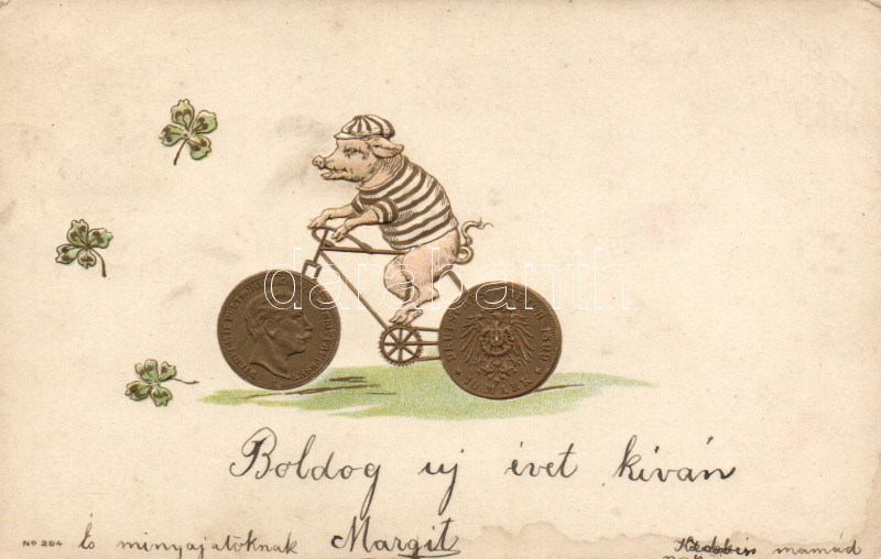 New Year cycling pig, Wilmelm II Ten Mark coins Emb. litho https://www.darabanth.com/hu/169-Gyorsarveres/169.0/Kepeslapok/Udvozlolap~4000114/New-Year-cycling-pig-Wilmelm-II-Ten-Mark-coins-Emb-litho~II568583