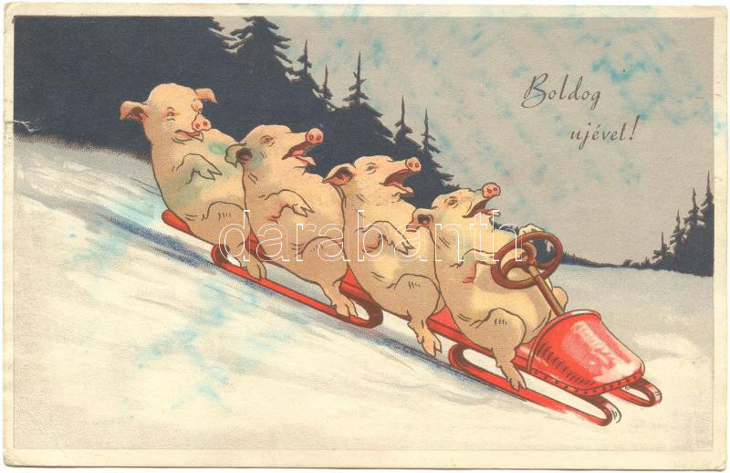 New Year, pigs, bobsled