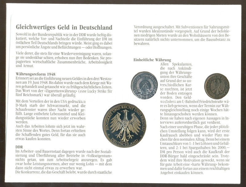 GFR 1990. 1 Mark + GDR 1978. 1 Mark + Germany 1990. "German Monetary Union" metal medallion in coin letter with stamps and information C:Unc,PP