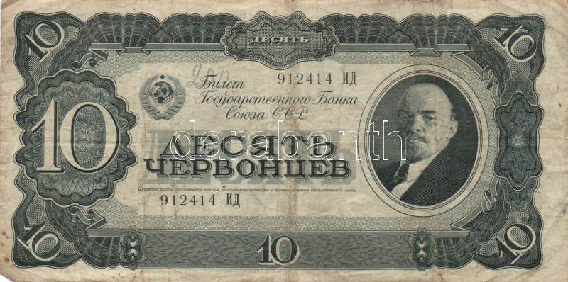Soviet Union 1937. 10 Chervonetz C:F https://www.darabanth.com/hu/169-Gyorsarveres/169.0/Numizmatika/Kulfoldi-bankjegyek~4000132/Szovjetunio-1937-10Ch-TIII-3Cbr3ESoviet-Union-1937-10-Chervonetz-CF~II546853