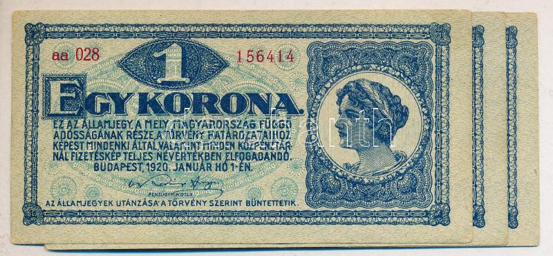 Leírás: 1920. 1K piros "aa" sor és sorozatszám (3x) egymás utáni sorszámokkal T:I-,II