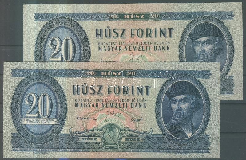Leírás: 1949. 20Ft (2x) T:I (egyik jobb szélén fényben kimutatható felfelé irányuló nyíl!)