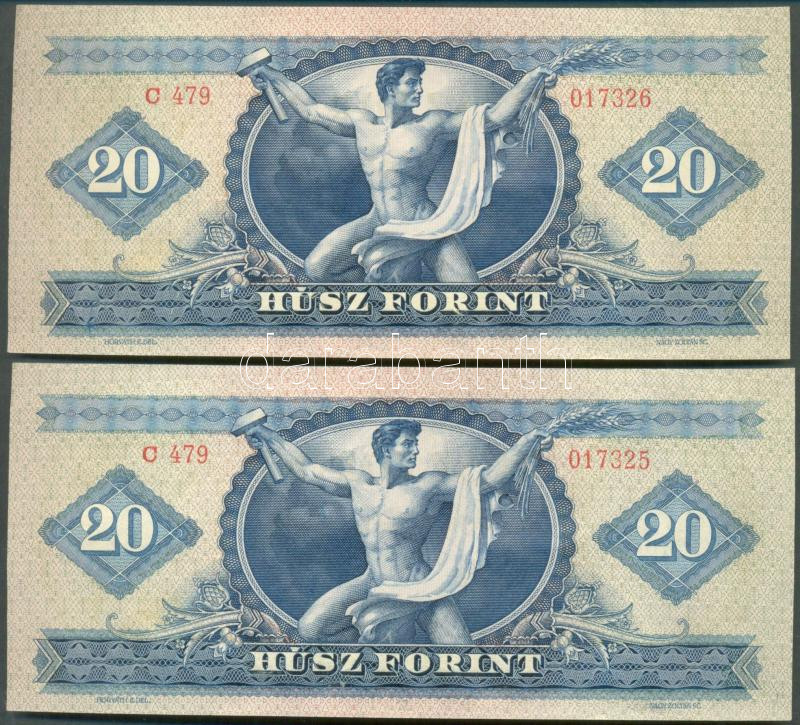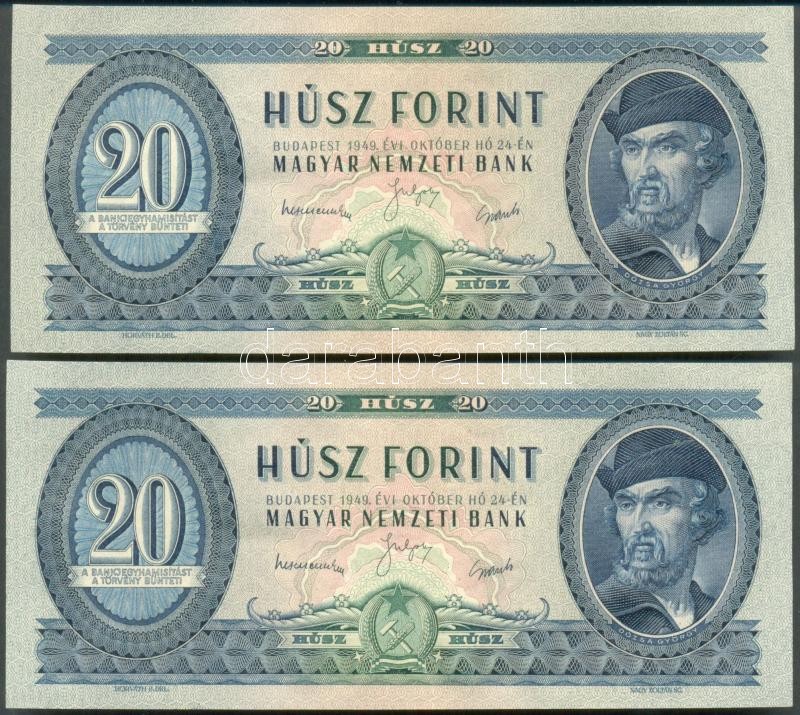 Leírás: 1949. 20Ft (2x) egymás utáni sorszámmal, egyiknél előoldalon felül a "20"-as számnál festékhiány T:I,I-