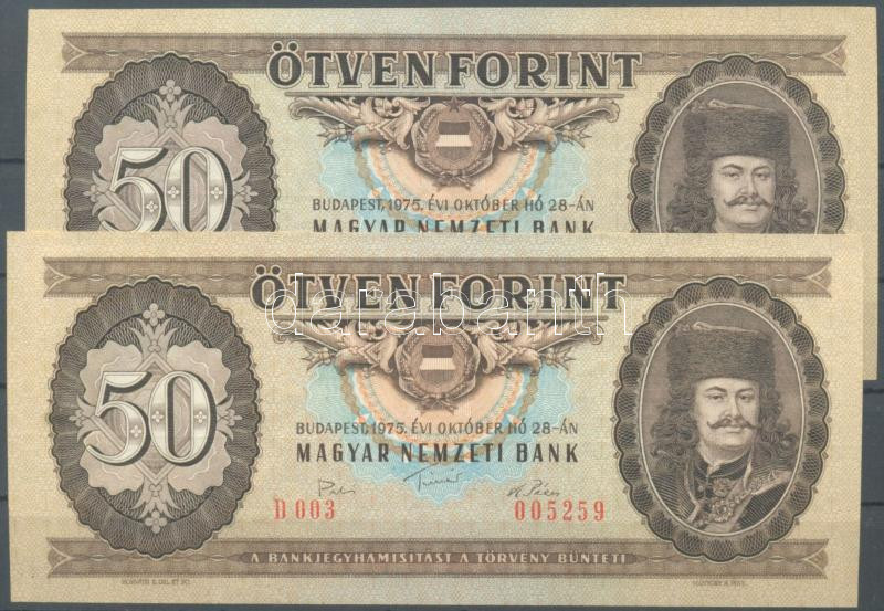 1975. 50Ft (2x), egyik "D 003" sorozat T:I https://www.darabanth.com/hu/169-Gyorsarveres/169.0/Numizmatika/Magyar-bankjegyek~4000128/1975-50Ft-2x-egyik-D-003-sorozat-TI~II569720