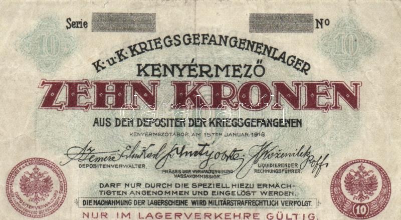 Leírás: Kenyérmező/hadifogolytábor 1916. 10K sor és sorozatszám nélkül lila pecséttel T:III